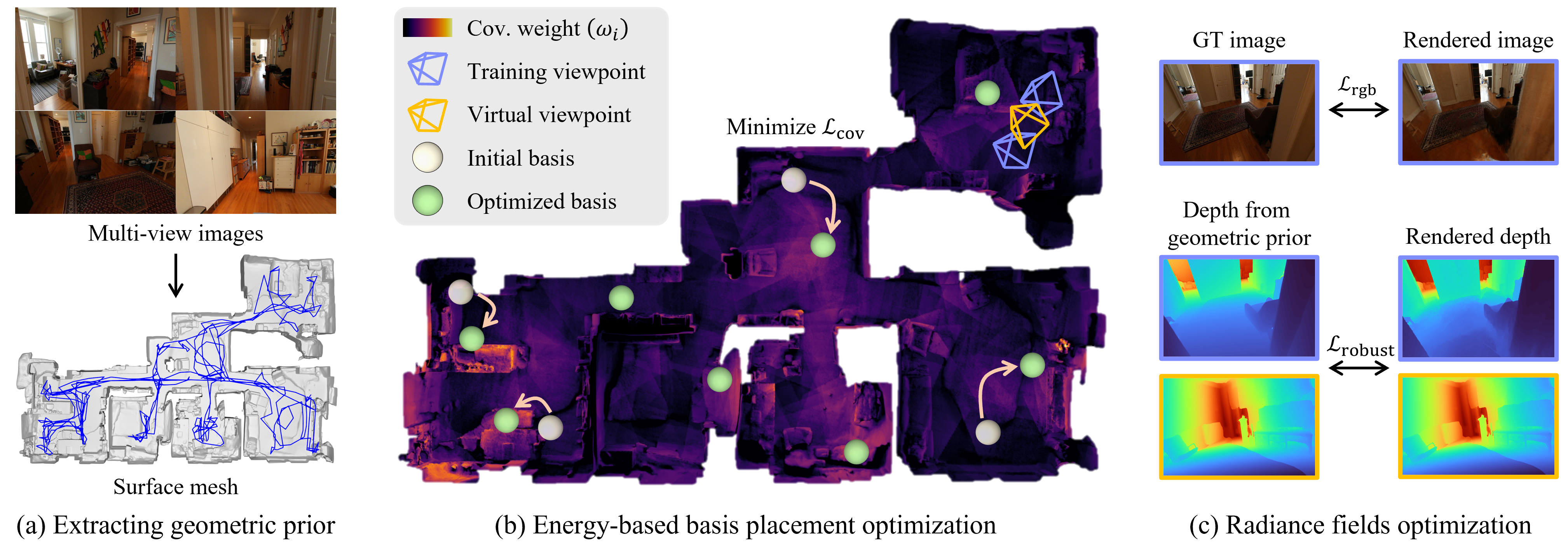 Method Overview. (a) We first extract the geometric scaffold from multi-view image observation. (b) Then we define coverage weights $w_i$ for surface points $\mathbf{x}_i$ on the obtained mesh surface, which consider both scene geometry and observation statistics. Starting from bases sampled along the camera trajectory using the FPS algorithm, we optimize their positions by minimizing the energy function $\mathcal{L}_{\text{cov}}$. (c) Finally, we optimize radiance fields with RGB supervision, guided by geometric regularization on training and virtual viewpoints.