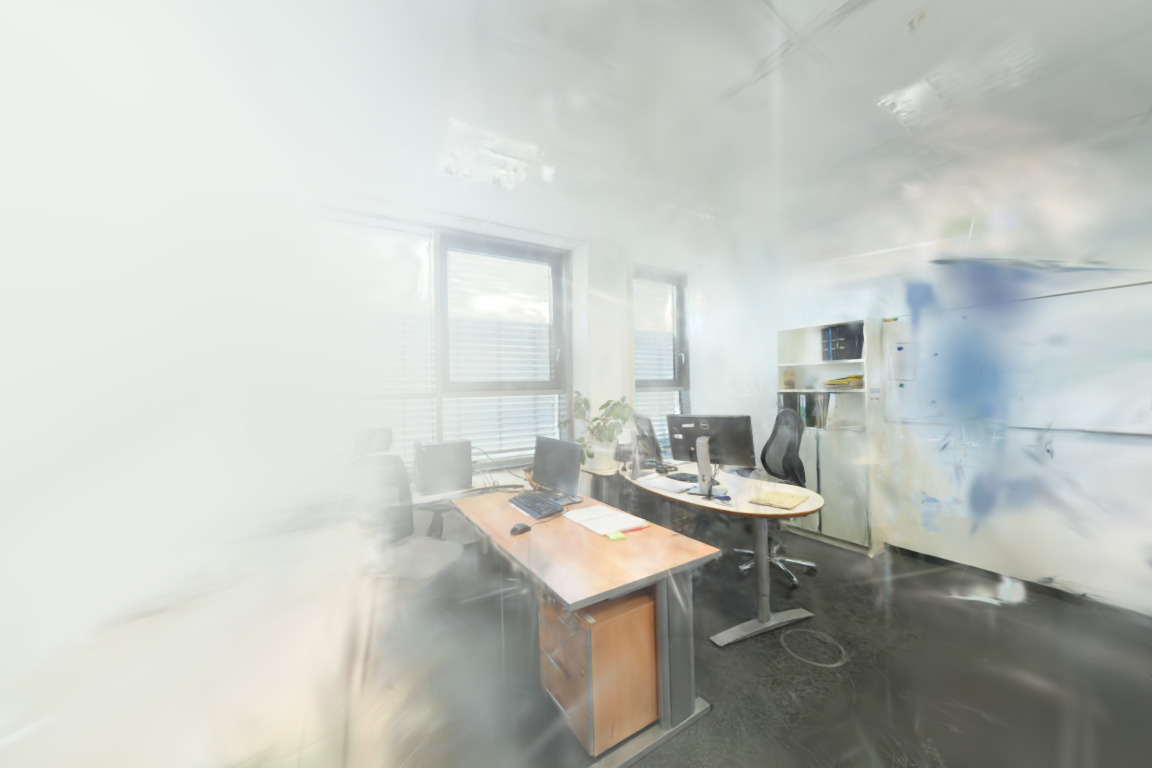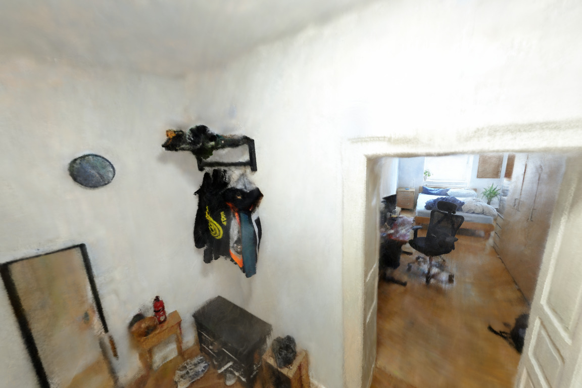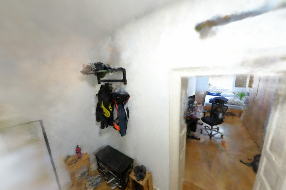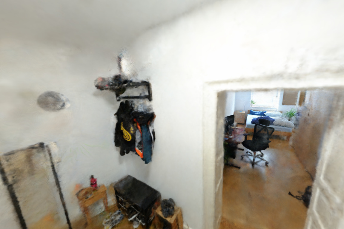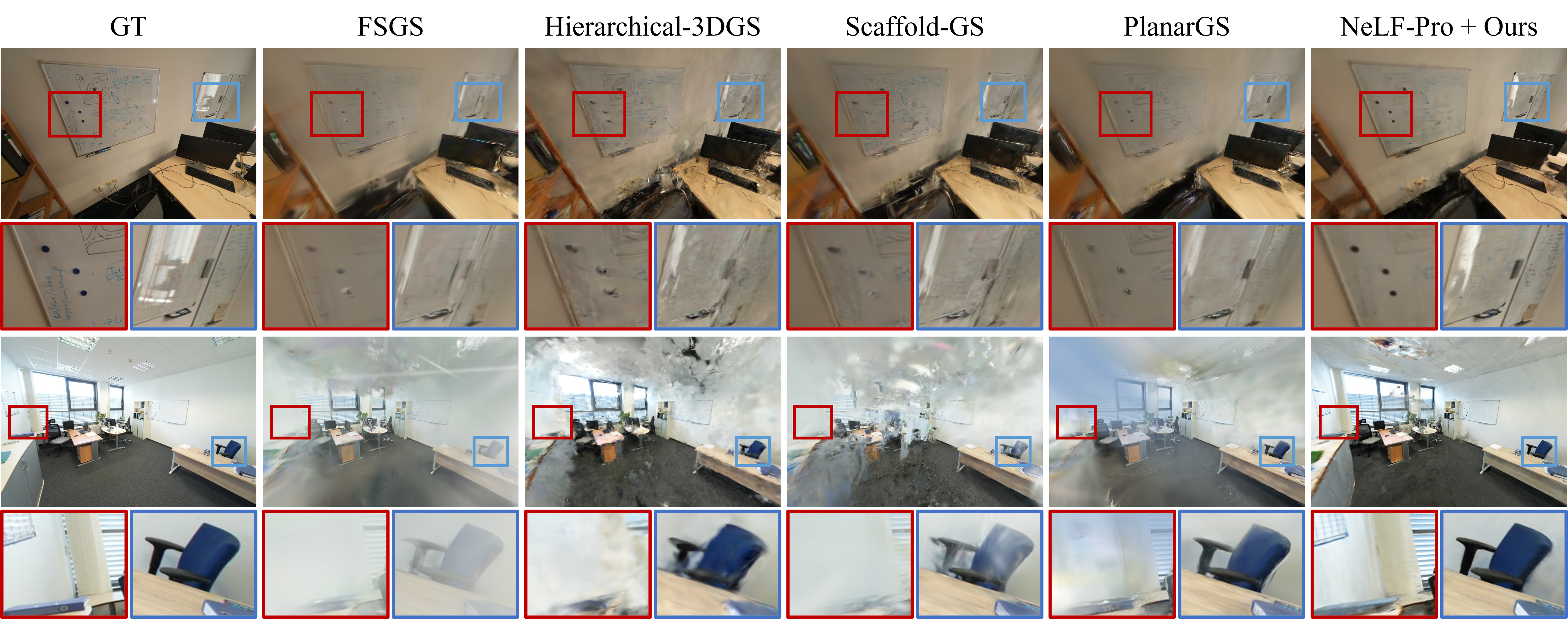 Qualitative results of novel view synthesis on ScanNet++ dataset. We compare our framework against NeRFacto, depth-regularized NeRFacto, 3DGS, and NeLF-Pro under severe extrapolation scenario.