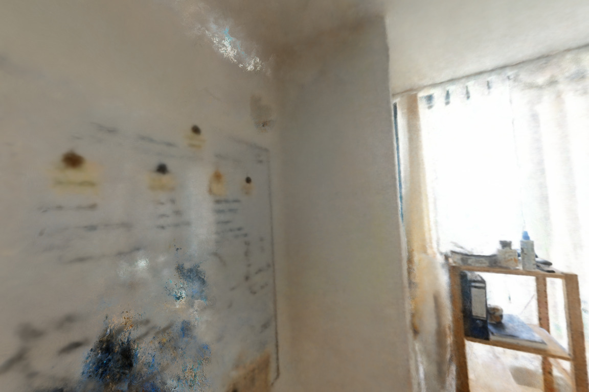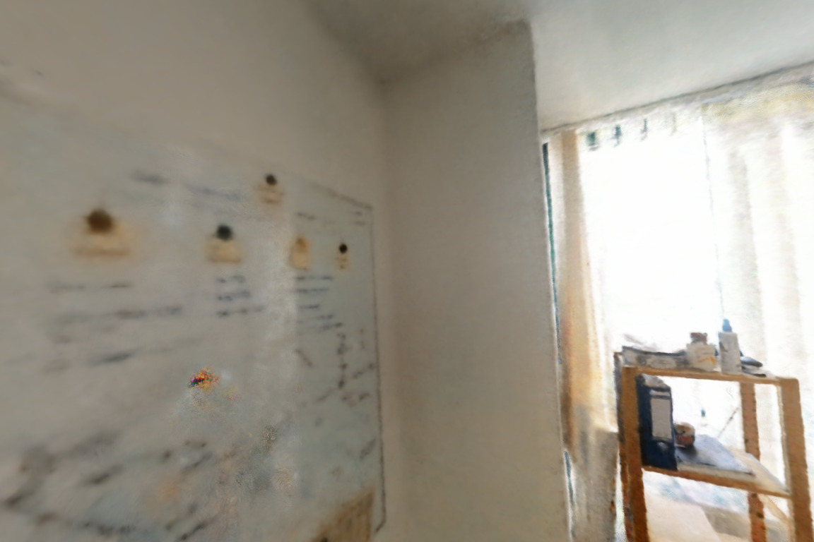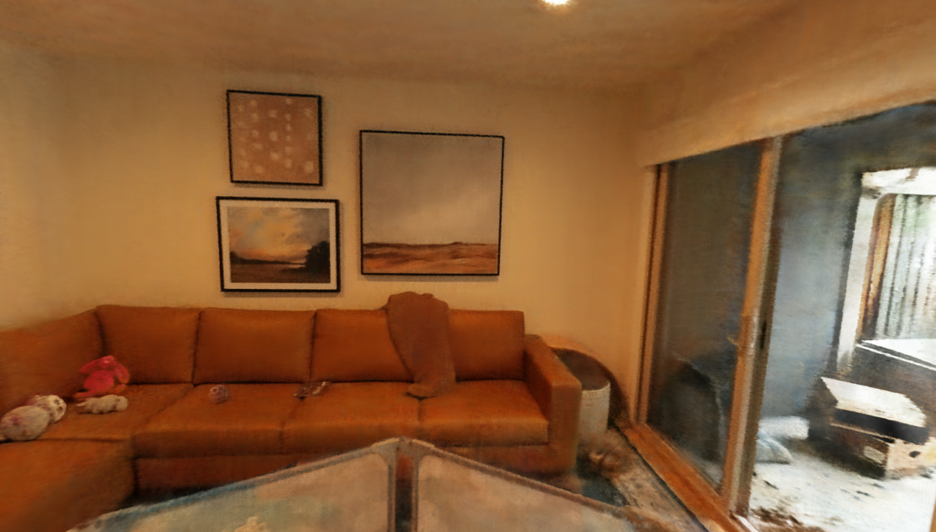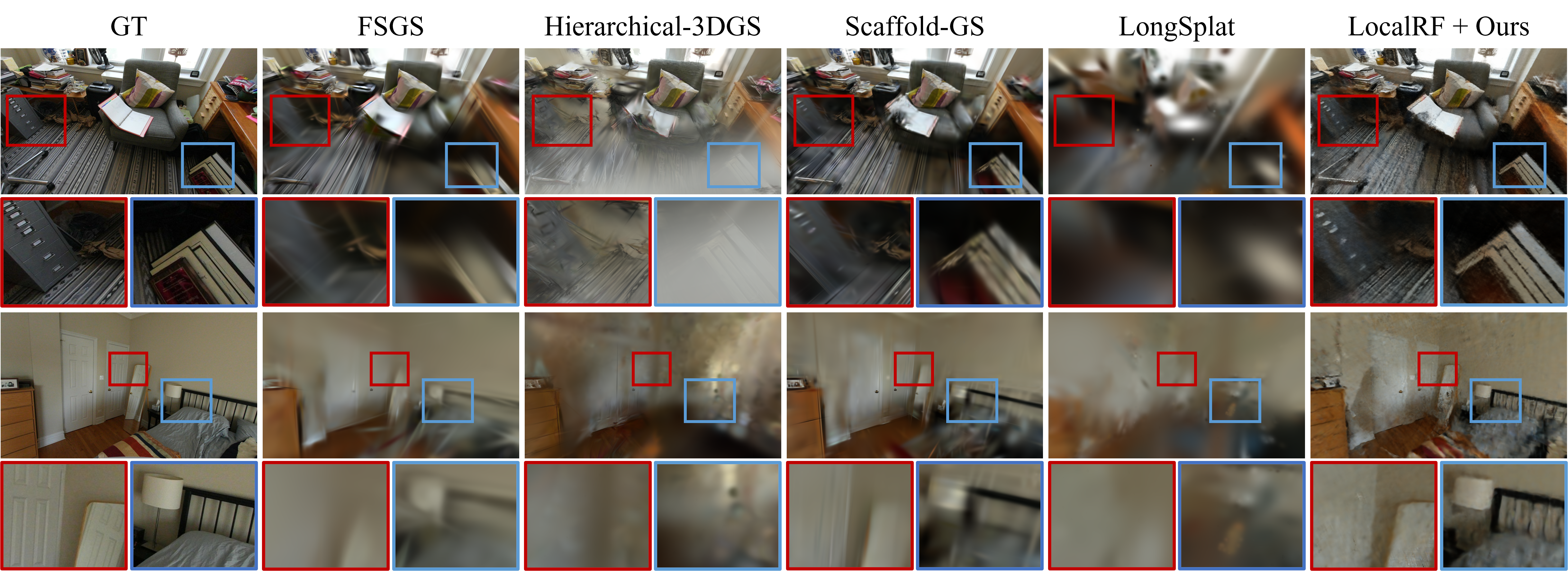 Qualitative comparison on ScanNet++. Our method outperforms state-of-the-art 3D Gaussian Splatting baselines under the sparse-view setting, producing sharper textures and fewer artifacts in challenging indoor scenes.