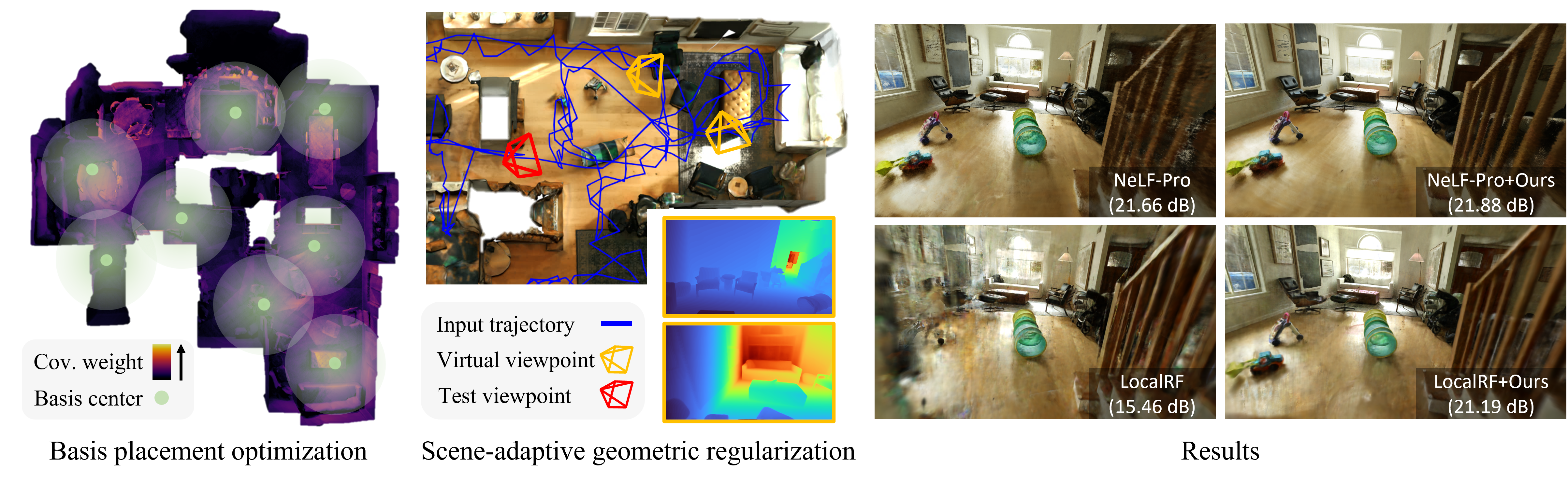 Free-viewpoint rendering on the Zip-NeRF NYC scene. By applying our geometry-aware scene configuration to NeLF-Pro and LocalRF, we demonstrate consistent improvements in rendering quality. Results generated from just 250 views.